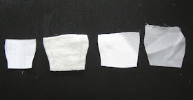 Vorlage - Schnitt aus Wollstoff (seitlich und unten Nahtzugabe), Schnitt aus festem Futter (wie Wollstückchen), Schnitt aus Chiffon (wie Wollstückchen, plus Nahtzugabe oben). Das ergibt eine Vorder- oder Rückseite der Corsage, also braucht man alles 2x.