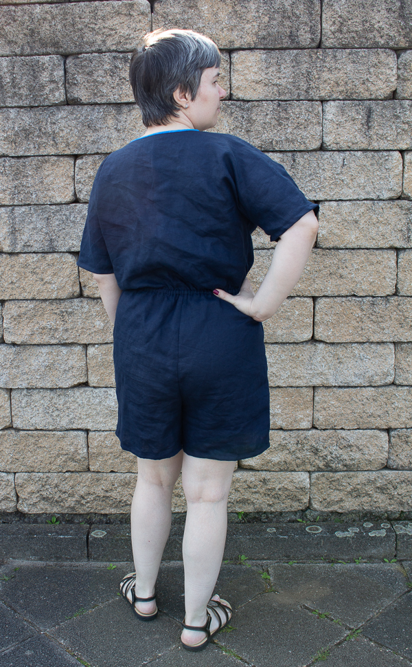 Was mich irritiert, ist die Länge: Halblange Ärmel bei einem kurzen Jumpsuit, der vorne mehr als luftig geschnitten ist? Für welches Wetter soll das taugen? Beim Herstellermodell sind die Ärmel hochgekrempelt, aber dafür ist mein Saum innen nicht hübsch genug. Werde die Ärmel vielleicht einfach kürzen.