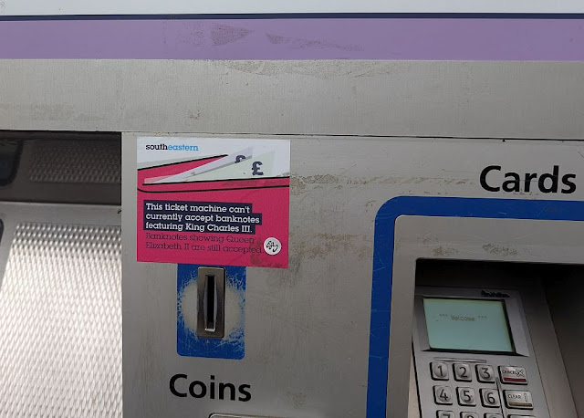 Bei einem enttäuschend un-aktuellen Fahrkartenautomaten Tickets gekauft (zum Glück waren wir nicht auf Banknoten mit King Charles III. angewiesen)
